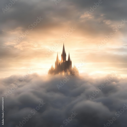 Fototapeta premium fantastical castle emerging from clouds at sunrise