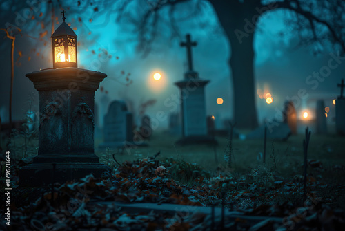 © Oleksandr, Fototapeta premium Fantastically mysterious cemetery with tombstones and terribly scary atmosphere, abstract vivid composition consists of fictional unreal fantastic vision on background