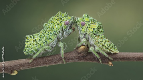 © SHI, Obraz premium Fantastically shaped treehoppers with electrical charge visualizations surrounding their uniquely evolved bodies