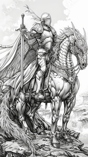 Naklejka premium Fantasy: A coloring book image of a brave knight in shining armor