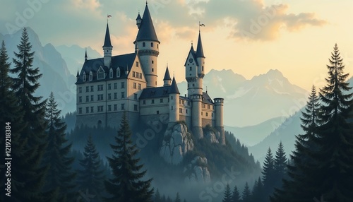 © Aleksandra, Fototapeta premium Fantasy castle in the mountains surrounded by trees during sunset