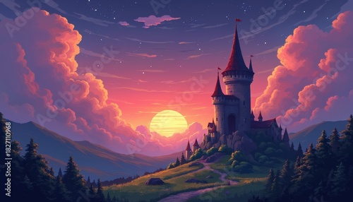 © Viktor, Fototapeta premium Fantasy castle on hill at vibrant sunset. Castle tower with red roof stands on rocky hill surrounded by trees, path. Purple clouds, stars in twilight sky. Peaceful landscape with scenic view. Digital