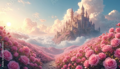© Maryna, Fototapeta premium Fantasy castle sits on hill covered in pink roses and clouds below blue sky. Sun shines bright over scenic landscape with blooming flowers. Fairytale architecture rises above mist.
