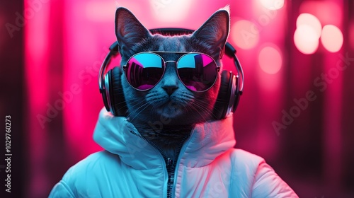 Fototapeta premium Fantasy cat-headed character in sleek headphones and reflective sunglasses,...