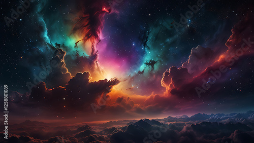 Fototapeta premium Fantasy cloudscape with colorful nebula and stars. 3D rendering