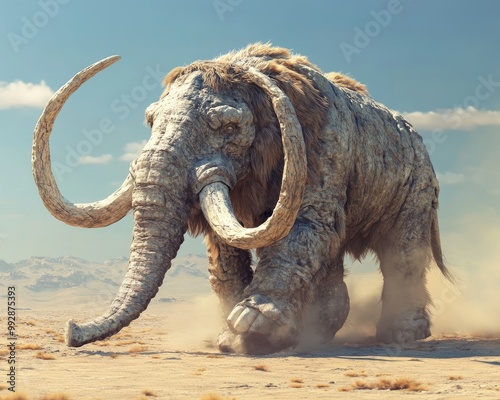 Obraz premium Fantasy colossal mammoth prancing across a dry desert landscape in a striking 3D illustration