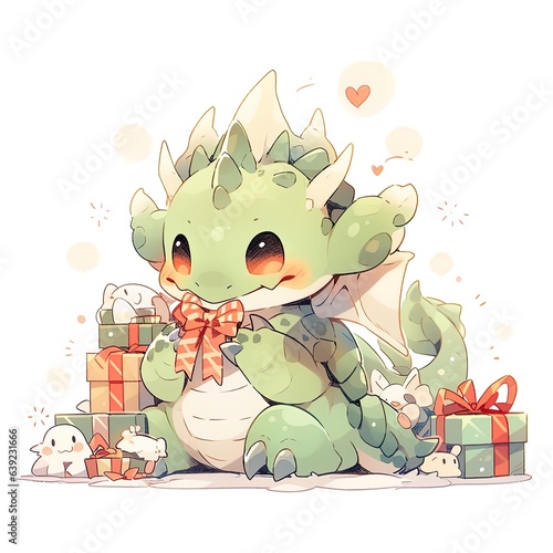 © Irina, Obraz premium Fantasy cute dragon with christmas hat, новогодняя открытка, New Year 2024. Generative AI