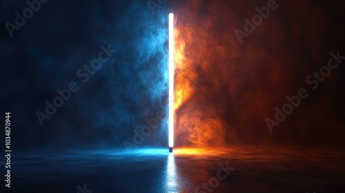 Obraz premium Fantasy 3D rendering of a white light stripe representing a magic wand against a dark backdrop illuminated by reflections in blue and orange