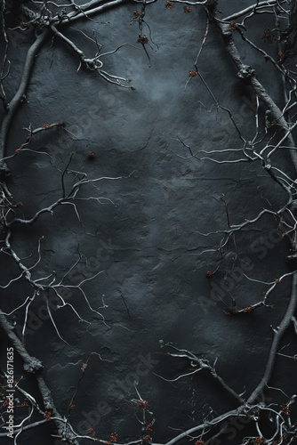 Naklejka premium Fantasy dark Gothic backdrop framed by dry branches, thorns, ivy. Old worn black grunge background bordered with horror dry branches and thorns. Medieval cinematic dark fantasy concept.