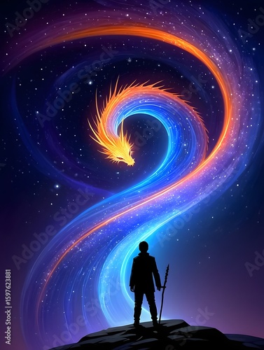 © Lens Vivid, Fototapeta premium Fantasy dragon in space art print, celestial dragon artwork, cosmic dragon poster design