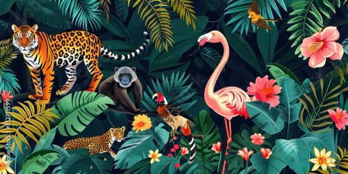Obraz premium Fantasy Jungle, tropical illustration. wild African animals. Amazon forest animal