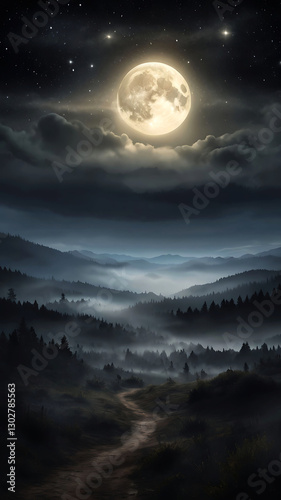 © Nadeesha, Fototapeta premium Fantasy landscape forest with beauty of starry night sky and full moon