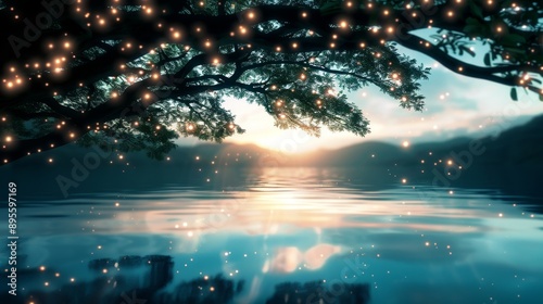 Naklejka premium Fantasy landscape of a serene lake surrounded by luminous charms, with a...