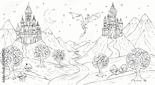 © Handrey, Naklejka premium Fantasy landscape with castles, mountains, dragon, moon and trees for coloring book