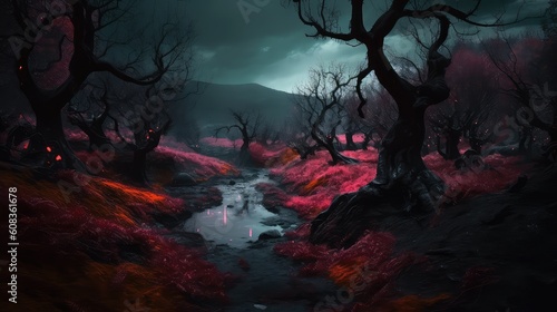 Fototapeta premium Fantasy, mystical landscape. Strange spooky magical forest
