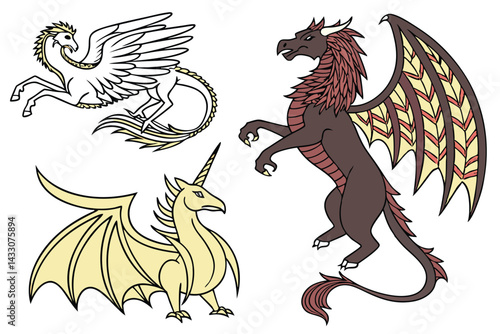 Naklejka premium Fantasy Mythical Creatures Illustration Featuring Dragon, Phoenix, Pegasus,...