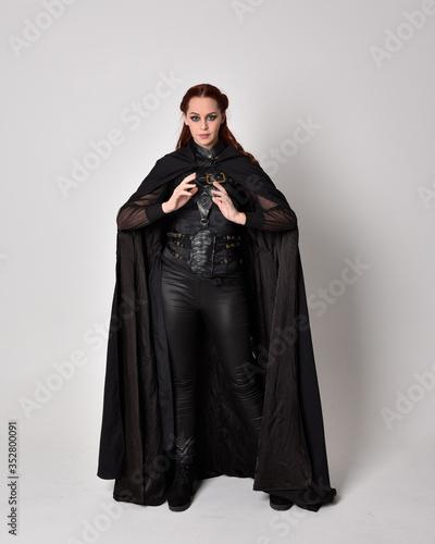 © faestock, Fototapeta premium fantasy portrait of a woman with red hair wearing dark leather assassin costume with long black cloak. Full length standing pose isolated against a studio background.