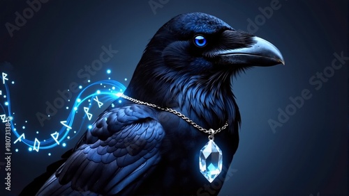 © vvicca, Naklejka premium Fantasy raven with a glowing blue eye wearing a crystal pendant on a chain, surrounded by magical blue runes and light trails on a dark background.