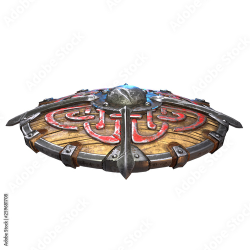 Obraz premium Fantasy round viking wooden shield on an isolated white background. 3d...