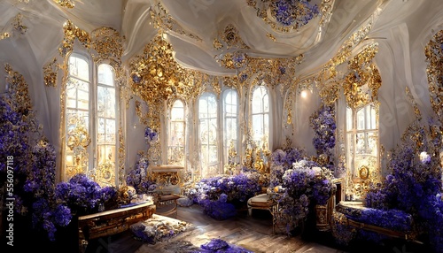 © Erelis Emporium, Obraz premium Fantasy scene of luxury golden and violet interior. Generative ai.