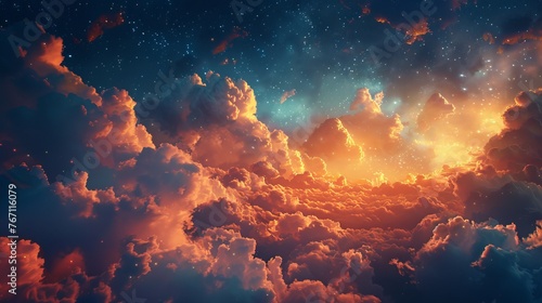 Obraz premium Fantasy sky filled with fluffy, glowing clouds under stars, creating...
