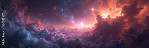 © Vadym, Naklejka premium Fantasy space background. Starry sky with pink, purple, blue, and orange colors. Universe, clouds, stars, and planets. Cosmic wallpaper. Space theme for kids, children. Sci-fi background concept.