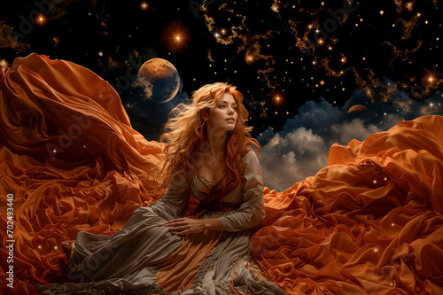 Naklejka premium fantasy style image of a beautiful red haired woman in front of the space with stars and planets