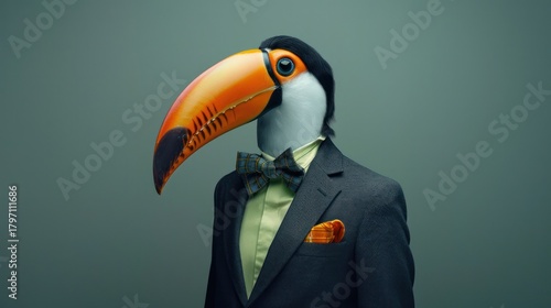 © Eyepain, Fototapeta premium Fantasy Toucan dressed in an elegant suit with a nice bow tie, confident and classy. Fashion portrait of an anthropomorphic animal, bird, posing