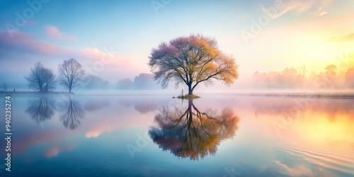 Fototapeta premium Fantasy tree in pastel colors reflecting on a lake with fog , fantasy, tree,...