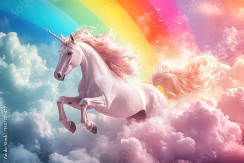 Fototapeta premium Fantasy unicorn soaring through colorful clouds in a dreamy landscape during...
