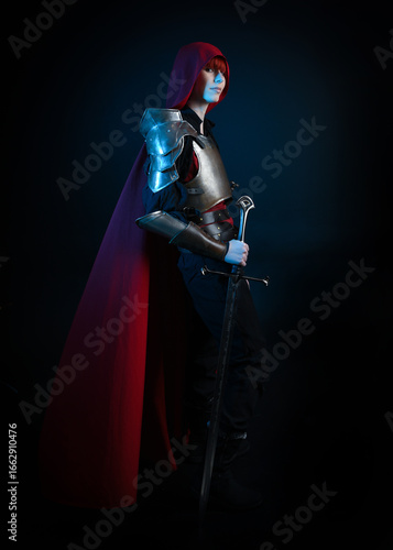 Naklejka premium Fantasy warrior woman with red hair in historical medieval armour costume and red fairytale cloak, cinematic studio portrait of strong heroine knight, dramatic standing profile silhouette figure.