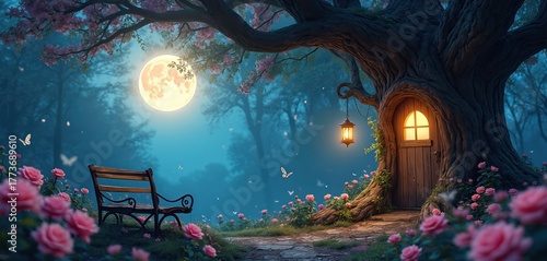 Naklejka premium Fantasy world scene shows fairy house in tree at night. Bench sits amid blooming roses. Lantern lights door to enchanting home under moonlight with floating butterflies in fabulous enchanted forest.