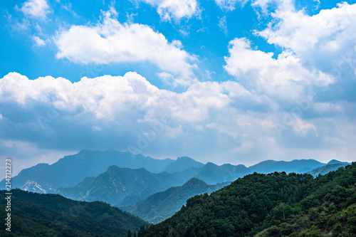 © Jikai Zhang, Fototapeta premium Far view of Mount Tai in summer time, with its peak was surrounded by cloud