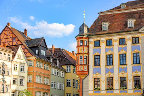 Fototapeta premium Farbenfrohe historische Altstadthäuser mit zweistöckigem Erker am Rathaus am Marktplatz in Coburg, Deutschland, Europa