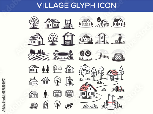 © Biplob, Fototapeta premium Farm and Agriculture Village - Set of Thin Line Vector Icons