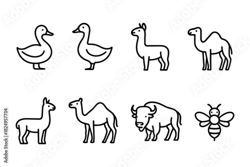Naklejka premium Farm and desert animal icon collection. Duck, camel, alpaca, bison and bee for agriculture, nature and wildlife projects. Vector illustration.