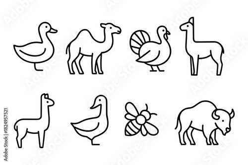 Obraz premium Farm and exotic animal icon set. Duck, camel, turkey, alpaca, bee and bison for agriculture, farming and nature projects. Vector illustration.