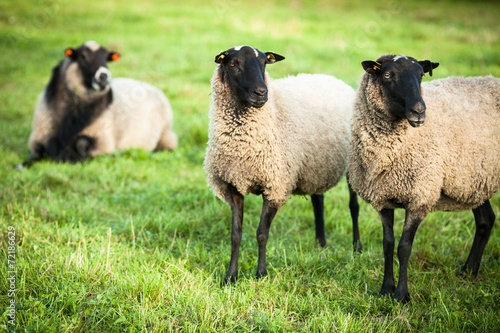 © mdennah, Obraz premium Farm animals: black-head sheeps grazing on a green pasture