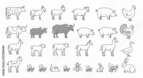 Obraz premium Farm Animals, Livestock, and Common Insects Line Icon Set