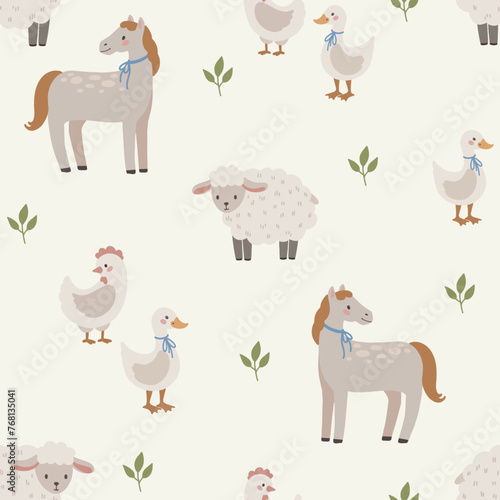 © Sasha Franz, Naklejka premium Farm animals seamless pattern hand drawn cute kids background vintage retro pallete, horse, sheep, chicken, goose