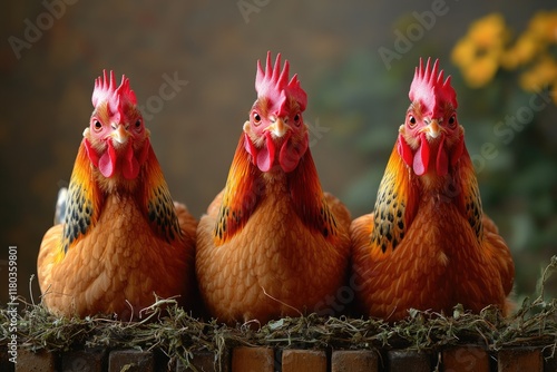 Fototapeta premium Farm animals sitting on a stack of hay, close up