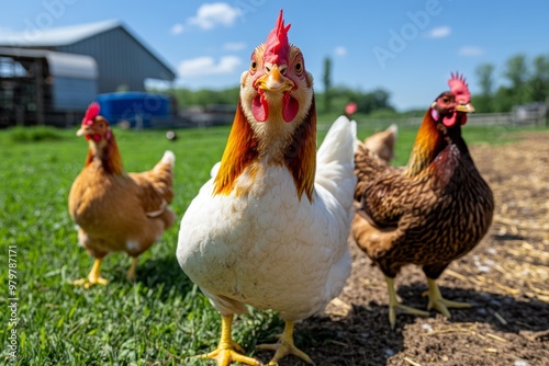 Fototapeta premium Farm animals such as chickens and ducks roaming freely around the farmyard