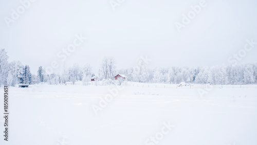 © Conny Sjostrom, Fototapeta premium Farm bran and house in a cold winter landscape with snow and frost in christmas time