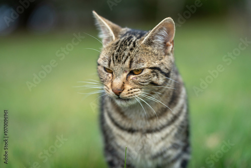 Fototapeta premium farm cat walking on the lawn outside