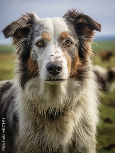 Fototapeta premium Farm dog shepherd with beautiful countryside in the background