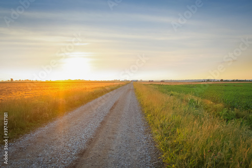 Naklejka premium farm equipment on dirt road through fields under evening sun light