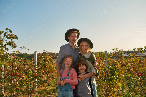© Svitlana, Fototapeta premium Farm family hug and look at camera in garden