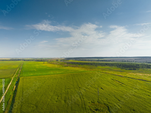 © nordroden, Obraz premium Farm green fields giving good harvest grow against blue sky