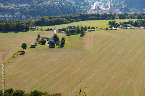 © kelifamily, Obraz premium Farm houses and agricultural fields from above. Top view