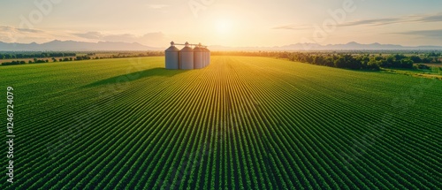© Chanwit, Fototapeta premium Farm landscape featuring a red barn surrounded by green fields and a clear blue sky